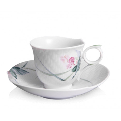 Espressotasse m.U., Form "Wellenspiel Relief", Waldflora mit Insekten, bunt, weißer Rand, V 0,09 l