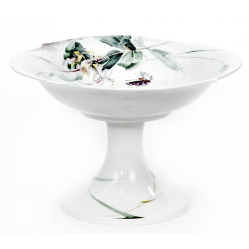 Schale auf Fuß, Form "Wellenspiel Relief", Waldflora mit Insekten, bunt, weißer Rand, H 14 cm