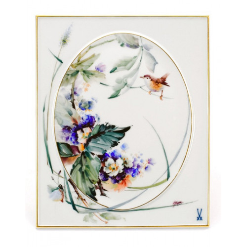 Wandplatte, Vogelmotive nach Gruber, bunt Goldrand, 20,5 x 25 cm