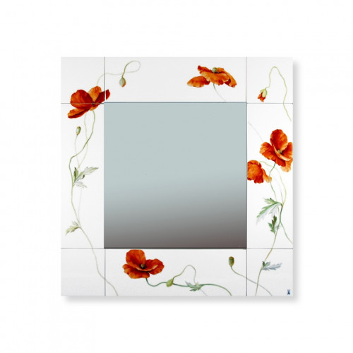 Spiegel komplett, Blumenmalerei "Wilder Mohn", rot, weißer Rand, 50x50 cm