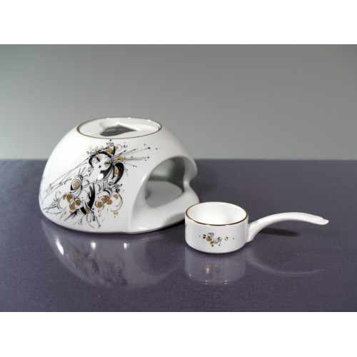Stövchen Wellenspiel, Festlicher Ball, Federarbeit, gelb glasiert, Goldrand, ø 16 cm