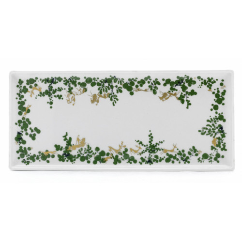 Platte, Waldzweige m.Wild u.Reiter,komb.Untergl.grün u.Aufglasur gold,weiß.Rd., 30x13,5 cm