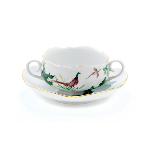 Suppentasse m.U., Form "Großer Ausschnitt", Jagdmalerei,kombiniert Unterglasur,grün und Aufglasur,bunt,Goldrand, V 0,20 l