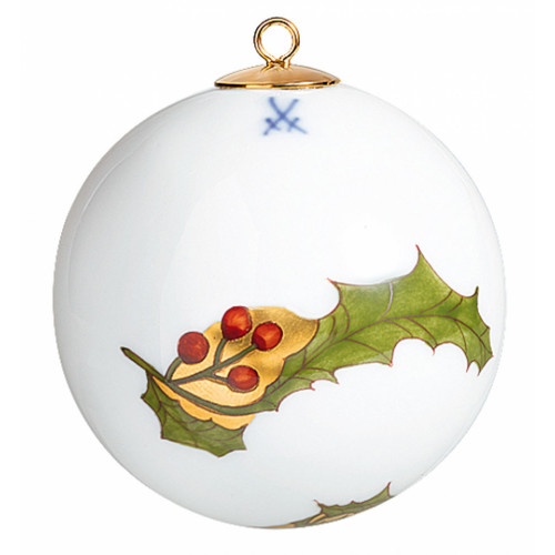 Kugel, Stechpalme, Federzeichnung rot, grün und gold, Goldflächen, weißer Rand, ø 5 cm
