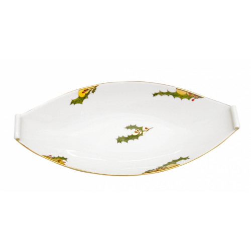 Beilageschale oval, Form "Neuer Ausschnitt", Stechpalme, bunt und gold, Goldrand, L 33 cm