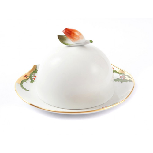 Käsedose, Form "Wellenspiel Pur", Stechpalme, bunt und gold, Goldrand, Ø 19 cm