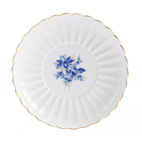 Beilageschale rund,gemuschelt, Form "Neuer Ausschnitt", Blumenbukett, kobaltblau, Goldgräser, Goldrand, Aquatinta, ø 16,5 cm