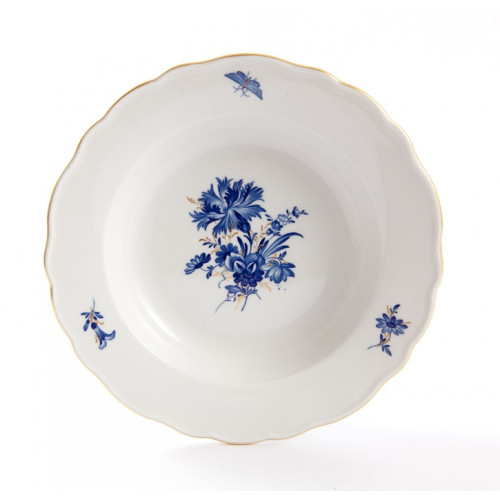 Suppenteller, Form "Neuer Ausschnitt", Blumenbukett, kobaltblau, Goldgräser, Goldrand, Aquatinta, ø 24 cm