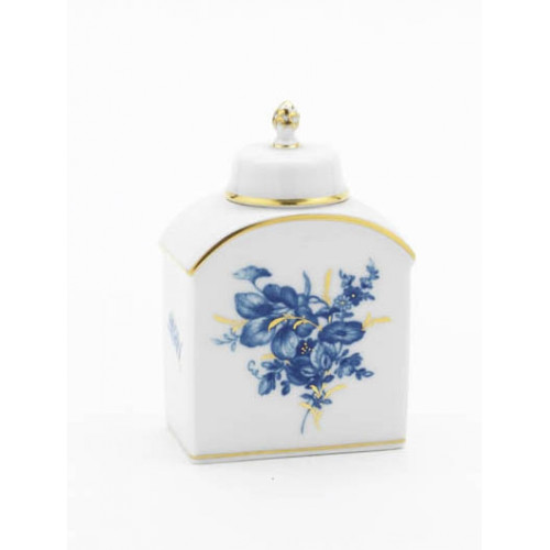 Teedose, Blumenbukett, kobaltblau, Goldgräser, Goldrand, Aquatinta, H 9,5 cm