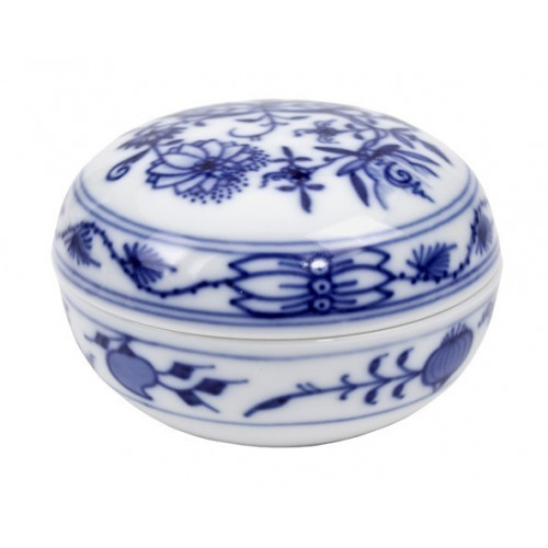 Dose, Form "Neuer Ausschnitt", Zwiebelmuster, kobaltblau, weißer Rand, ø 7,5 cm