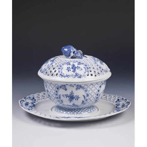 Dose mit Unterschale, Zwiebelmuster, kobaltblau, weißer Rand, L 27 cm