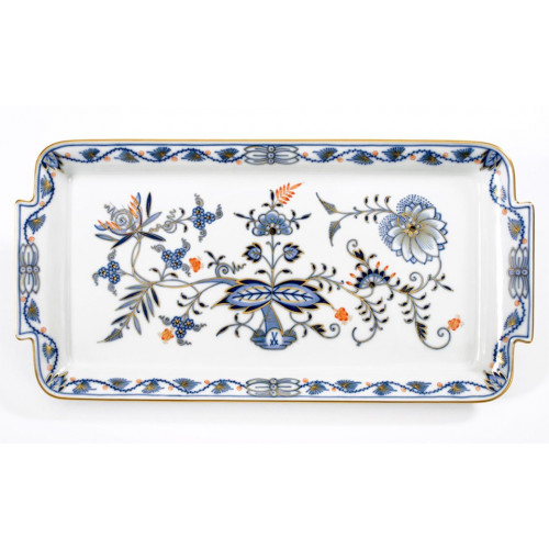 Platte,rechteck., Zwiebelmuster, kobaltblau, rot- und goldschattiert, Goldrand, L 29 cm