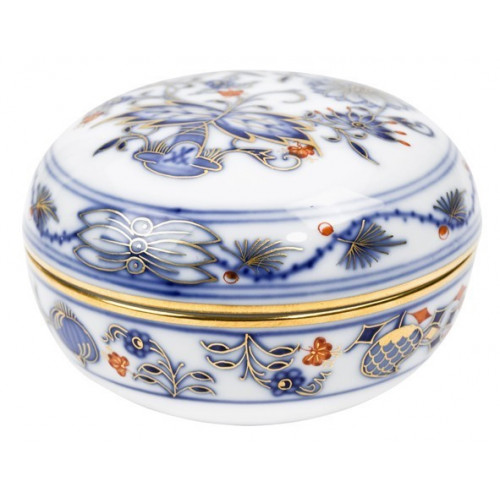 Dose, Form "Neuer Ausschnitt", Zwiebelmuster, kobaltblau, rot- und goldschattiert, Goldrand, ø 7,5 cm