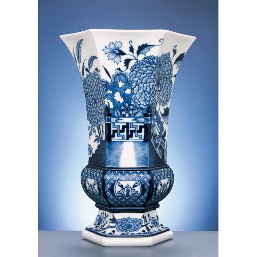 Vase Sechseckig, Chrysanthemenmuster, schieferblau, weißer Rand, H 27,5 cm