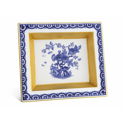 Als prächtiges Paar präsentieren sich Vide-Poche und Vase, und zwar im doppelten Sinne: Ihr Dekor vereint mit kobaltblauer Unterglasur, gerahmt von Brokatmalerei in 23-karätigem Gold, zwei Beispiele großartiger Meissener Porzellanmalerei. Schon zu Zeiten August des Starken (1670-1733) wurde das Weiße Gold® bei MEISSEN® mit blauen asiatischen Motiven dekoriert. Ihre Tiefe und Strahlkraft wird von der kostbaren, filigranen Goldbrokatmalerei betont. Wie eingraviert überziehen feinste Blütenornamente den mattgoldenen Grund - barocker Glanz in moderner Maltechnik und höchster Vollendung.