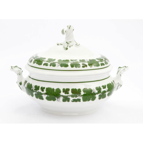 Terrine, oval mit Schnörkel, Form "Neuer Ausschnitt", Voller grüner Weinkranz, weißer Rand, V 3,50 l