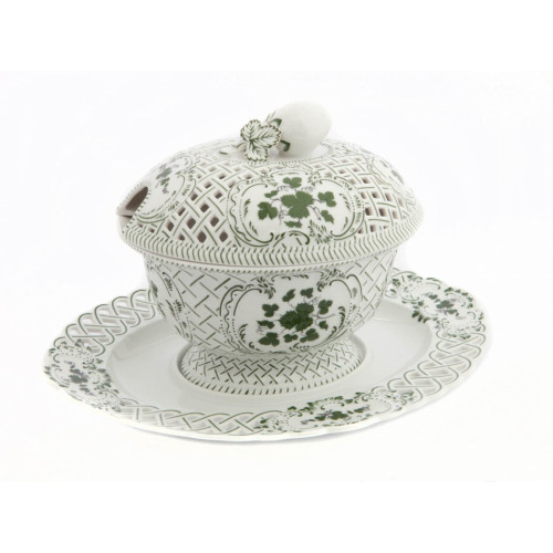Dose mit Unterschale, Voller grüner Weinkranz, weißer Rand, L 27 cm