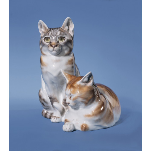 Anfang des 20. Jahrhunderts erlebte die Tierplastik eine Renaissance in Meissener Porzellan. Namhaften Bildhauern der Jugendstilzeit war es eine besondere Ehre und Inspiration, für Europas älteste Porzellan-Manufaktur exklusive Tierfiguren zu gestalten und sich mit einer großen Tradition auseinanderzusetzen. Zu den Pionieren der modernen Meissener Fauna zählt der Dresdner Tierplastiker Otto Pilz, dessen frühes Katzenpaar aus dem Jahr 1906 bereits alle Merkmale seines exzellenten Modellierstils aufweist. Der ruhige, klare, fast nachdenkliche Blick der sitzenden Katze bildet einen interessanten Gegensatz zu den zusammengekniffenen Augen ihres Gefährten. Allein durch die meisterhafte Aufglasurbemalung der Meissener Staffagekünstler bekommen die Katzenaugen jene realistische Tiefe, die das Tier auch wirklich „lebensecht“ blicken lässt.