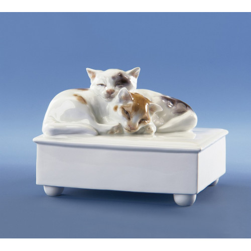 Erich Hösel, zwischen 1912 und 1929 Gestaltungsleiter der Manufaktur, besaß ein Faible für realistische, konventionell gehaltene Tierplastiken, von denen einige aus unserem Figurensortiment nicht mehr wegzudenken sind. Ob nun in Böttgersteinzeug oder in farbig staffiertem Porzellan: Die Tiermodelle des akademisch ausgebildeten Bildhauers zeichnen sich durch eine unaufdringlich traditionelle Gestaltungsweise aus, in der die Liebe zum Detail im Dienst der lebendigen Gesamterscheinung steht. Für seine beiden sich aneinander schmiegenden Katzen aus dem Jahr 1917 hat Hösel ganz bewusst eine Kommode in die Gestaltung mit einbezogen, um die realistische Wirkung zu verstärken.