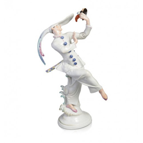 Mit den Modellen, die er zwischen 1913 und 1937 für Meissen geschaffen hat, „antwortet“ Paul Scheurich auf die klassische Figurenwelt des Meissener Rokoko. Ähnlich wie unsere Porzellanmeister vor 250 Jahren ließ er sich von Motiven aus der Welt des Theaters und der Mythologie inspirieren und widmete sich immer wieder den Themen Tanz, Maskerade, Galanterie und Groteske. Bei der Gestaltung seines Maskentänzers griff Scheurich wie schon Kaendler auf Kupferstiche des französischen Zeichners Jacques Callot zurück, fand aber, auch das eine Parallele zum großen Vorgänger, eine ganz eigene Sprache plastischer Interpretation. Beachten Sie den eleganten S-Schwung zwischen Hutfedern und linkem Arm, oder die doppelt geschwungene Linie zwischen eben diesen Federn und dem angehobenen Bein: Darin liegt eine mondäne Sinnlichkeit und Eleganz, wie sie nur Scheurich, getragen vom Zeitgeist der 1920er Jahre, in Porzellan zu gestalten vermochte. Der unheimlich anmutende Komödiant auf Callots Zeichnung hat sich in einen schönen Tänzer verwandelt, der mutig, fragend, verzückt von seinem zweiten, hässlicheren Masken-Ich Abstand nimmt. Und gerade diese Abwehrhaltung gegenüber dem „alter ego“ verleiht dem Tanz seine Spannung und Dynamik. Es ist für unsere Gestalter und Staffiermaler immer wieder eine Herausforderung, dieses Meisterwerk für Sie zu fertigen, und zwar in einer Form, die die uneingeschränkte Zustimmung Scheurichs finden würde.