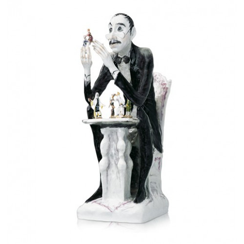 Sieht diese Figur nicht einem Schauspieler ähnlich? Richtig vermutet, denn dargestellt ist Armin Müller-Stahl in seiner Rolle als Baron Kaspar Joachim von Utz in einem Film des niederländischen Regisseurs George Sluizer aus dem Jahr 1992. Nach der gleichnamigen Romanvorlage „Utz“ von Bruce Chatwin führt uns der Film das Schicksal eines leidenschaftlichen Sammlers vor Augen, der sich von seinen Meissener Porzellanfiguren nicht nur nicht trennen kann, sondern sein Leben ganz und gar in den Dienst ihrer Bewahrung und Vermehrung stellt. Peter Strang war von der Premiere des Films auf der Berlinale 1992 und der Verleihung des "Silbernen Bären" an Armin Müller-Stahl so beeindruckt, dass er sich zur Schöpfung dieser Portraitfigur entschloss. Sie ist beides: gelungenes Portrait des Schauspielers und brillante Momentaufnahme des Barons in andächtiger Sammlerpose. Wie schon bei manchen Meissener Kompositionen des 18. Jahrhunderts werden wirkliche Meissener Formen, hier Porzellanfiguren der italienischen Komödie, in die Szene integriert, ein Meisterstück, handelt es sich doch um die bisher kleinsten plastischen Darstellungen dieser beliebten Meissener Figurenserie. Die Figur „Utz“ alias Armin Müller-Stahl ist mittlerweile selbst zu einem beliebten Sammlerstück geworden - nicht zuletzt für den in Kalifornien lebenden Schauspieler, dem sein Konterfei in Porzellan von Peter Strang persönlich anlässlich der Deutschlandpremiere von "Utz" in Dresden 1993 überreicht worden war.