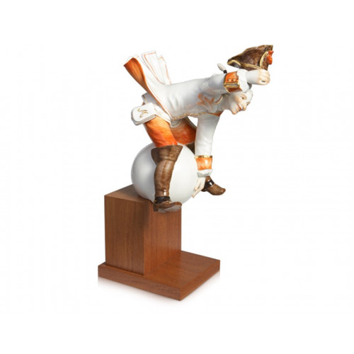 Seit die Bilder laufen lernten, prägen Filmszenen unser kulturelles Gedächtnis. So werden Sie sich bei der Erwähnung des Barons Münchhausen wahrscheinlich zuerst an die berühmte Szene aus dem Ufa-Film des Jahres 1943 erinnern, in der der notorische Aufschneider im Offiziersrock, dargestellt vom unvergesslichen Hans Albers, auf einer Kanonenkugel reitet. Genau diese Szene hat unser Modelleur Alexander Struck 1946 als Vorlage für sein erstes Münchhausen-Modell gewählt. Aus Anlass der Wiederaufführung einer gekürzten Fassung des Kinoerfolgs im Jahr 1953 hat Struck, ein Spezialist für literarische Figuren in Meissener Porzellan, das Modell nochmals überarbeitet und 1955 in einer kleineren Version an unsere Former und Bossierer übergeben. Es ging ihm, wie Sie unschwer erkennen können, nicht um ein exaktes Portrait von Hans Albers als Münchhausen, sondern um die Gestaltung seines eigenen Lügenbarons, zu der ihn die Filmszene inspiriert hat. Damit wurde die vergängliche Bildsequenz in die zeitlose und bleibende Form einer Meissener Porzellanfigur erhoben.