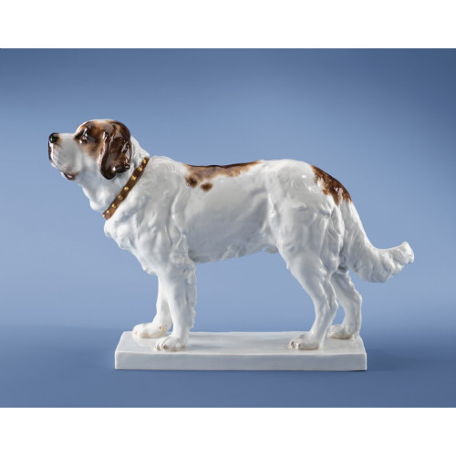 Die Zeit des Jugendstils war zugleich die Zeit der Renaissance der naturalistischen Tierplastik. Der von Emmerich Oehler 1906 geschaffene Bernhardiner zählt zu den frühesten Modellen, mit denen die Meissener Manufaktur auf innovative Weise an die eigene große Tradition der Tierfiguren anknüpfte. Treue, Gutmütigkeit und Kraft des alpinen Gefährten hat der akademisch ausgebildete Bildhauer so einfühlsam und lebensecht zum Ausdruck gebracht, dass die künstlerische Leitung der Manufaktur nicht lange überlegen musste, die Reproduktionsrechte an diesem Modell zu erwerben. Oehler war übrigens nicht ausschließlich auf Tierplastiken spezialisiert, sondern bewies sein Talent für Meissen auch auf dem Gebiet der menschlichen Kleinplastik.