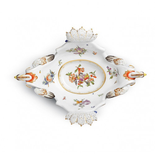 Bereits vor dem legendären „Schwanenservice“ schuf Johann Joachim Kaendler 1737 einen bedeutenden barocken Tafelaufsatz für seinen Gönner Heinrich Graf von Brühl – den „Indianischen Tafelaufsatz“, dessen zentrales Stück dieser Zitronenkorb ist. Zum Tafelaufsatz – gedacht für die ersten beiden „salzigen“ Gänge – gehörten neben dem Korb ein reich verzierter Untersatz sowie Senfbehälter, Öl- und Essigkännchen und Zuckerstreuer. Diese waren in Form fantastischer asiatischer Figuren gestaltet, teils auf Hähnen reitend. Beim Zitronenkorb finden sich die Hähne als kunstvoll ausgeformte „Griffe“ mit ausgebreiteten Flügeln auf Ästen sitzend, die mit plastisch aufgelegten Blüten und Blättern besetzt sind. Auf den Längsseiten ist jeweils ein beschirmtes Chinesenpaar zu entdecken, bekrönt von einer großen, durchbrochen gearbeiteten und partiell vergoldeten Muschel. Im Korb selbst sind Blumen- und Fruchtmalereien nach alter Manier zu bewundern. Limitierte Auflage.
