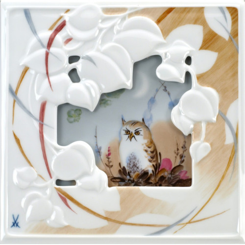 Sabine Wachs gestaltete dieses plastische Wandbild mit einem Uhu als Sinnbild der Weisheit in verschiedenen nuancierten Brauntönen. Malerei mit Unter- und Aufglasurfarben