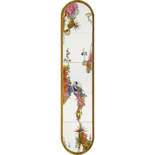 Mit feinnervigen, akkuraten Pinselstrichen lässt Gudrun Gaube auf diesem schmalen, hochformatigen Wandbild neben anderen Blüten die purpurnen Farbtöne einer Malve erstrahlen. Der Titel gebende Nachtvogel, eine Schleiereule, ist durch tiefdunkle Augen und einen herzförmigen Gesichtsschleier leicht zu erkennen. Ausführung mit Aufglasurfarben